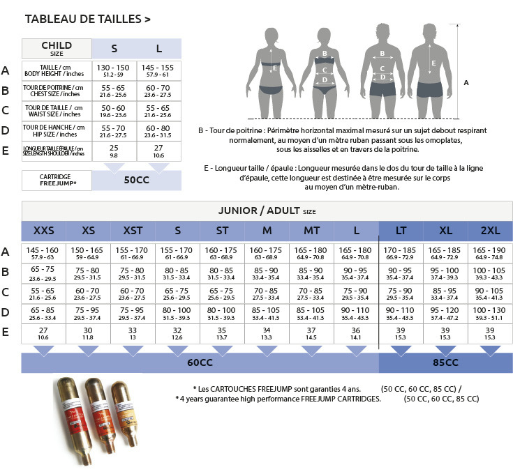 Cartouches : le gilet AIRSAFE est homologué pour des cartouches FREEJUMP uniquement. Il existe 2 tailles de cartouches :