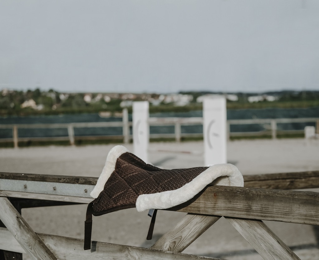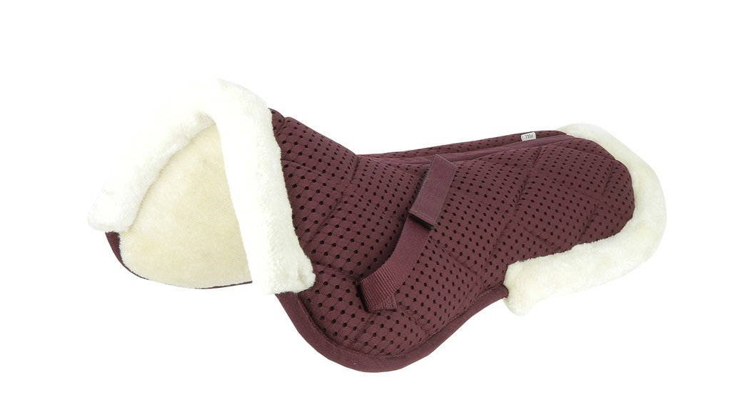 Amortisseur de dos en polyester mesh 3D, matelassage en mousse de 10 mm et remplissage en polyfil de 200 g/m2. Pattes d’attache auto-agrippantes. Doublure et col en faux mouton.