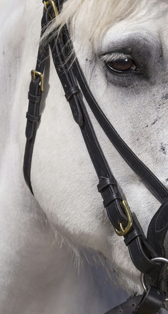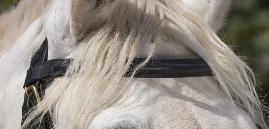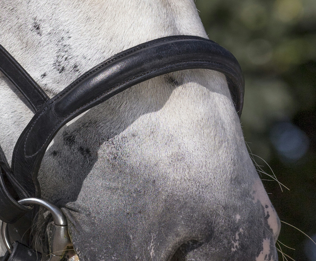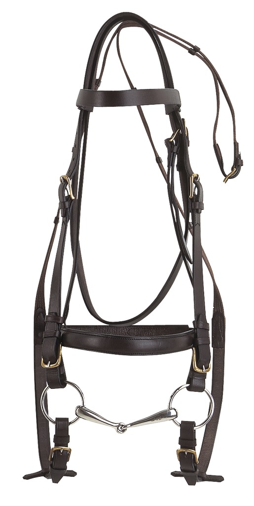 Largeur têtière 4,5 cm, largeur muserolle 3 cm. Rênes sangle.