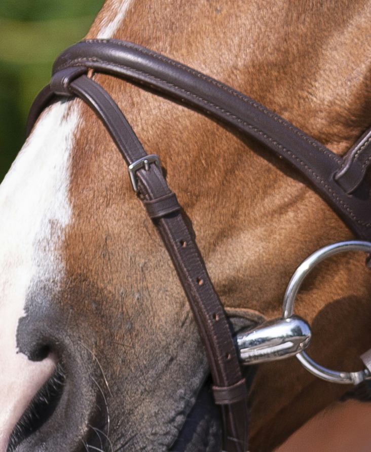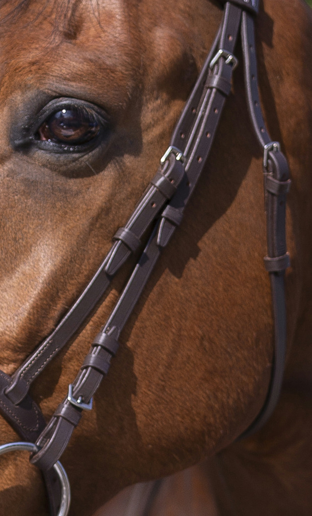 Bridon cuir de buffle teinté à cœur, muserolle combinée et frontal bombés ronds.