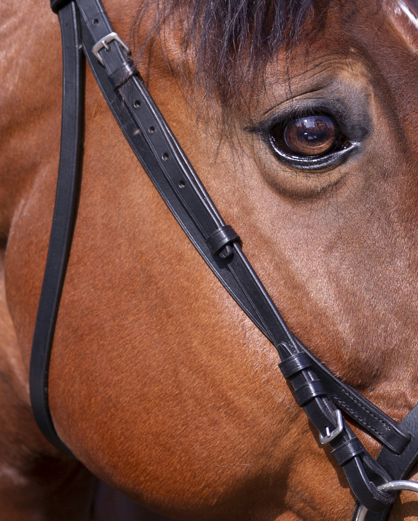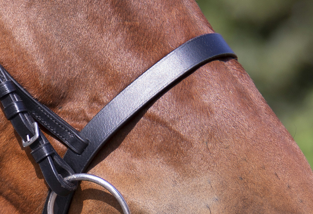 Bridon cuir de buffle teinté à cœur, muserolle française et frontal plat.