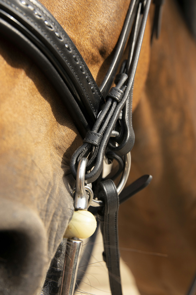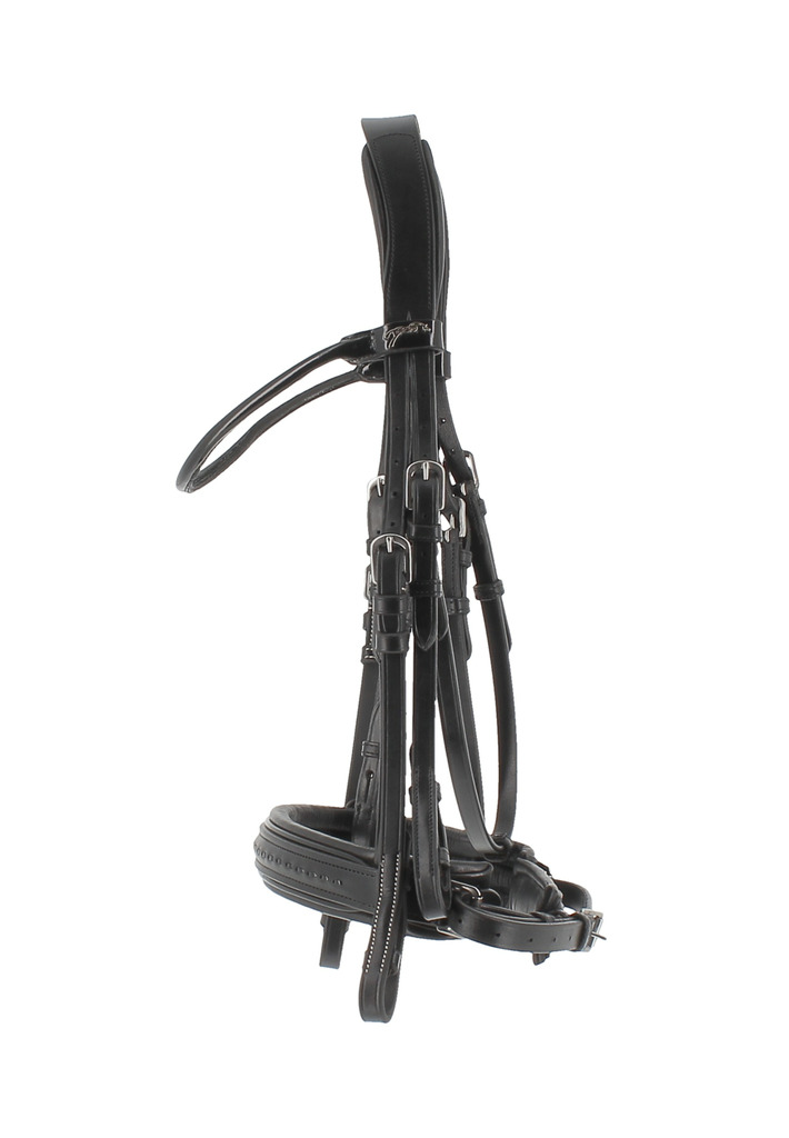 Bride de dressage avec deux paires de rênes. Une paire de rênes lisses et une paire de rênes hunters. Large têtière anatomique doublée, frontal rond verni anatomique. Muserolle très large entièrement doublée avec protection à l’arrière. Passant élastique permettant de retirer la protection si besoin. Point Sellier ton sur ton sur la muserolle. Passant élastique à l’intérieur des montants de filet pour supporter les mors. Particulièrement apprécié par les chevaux avec une bouche sensible qui n’apprécient pas le contact du mors sur les barres. Cuir 100% cuir de vachette bouclerie 100% acier inoxydable