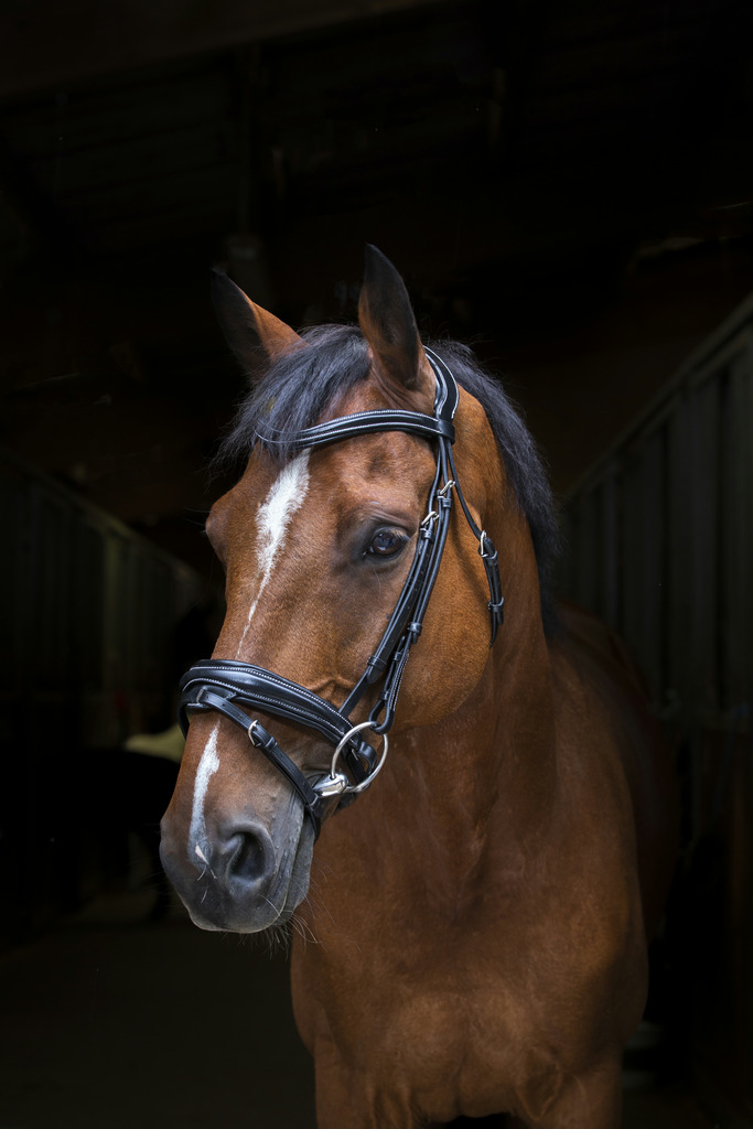 Bridon en cuir de buffle, têtière découpée large, frontal en « V » et muserolle combinée, doublés cuir vachette matelassé. Coutures blanches. Vendu sans rênes.