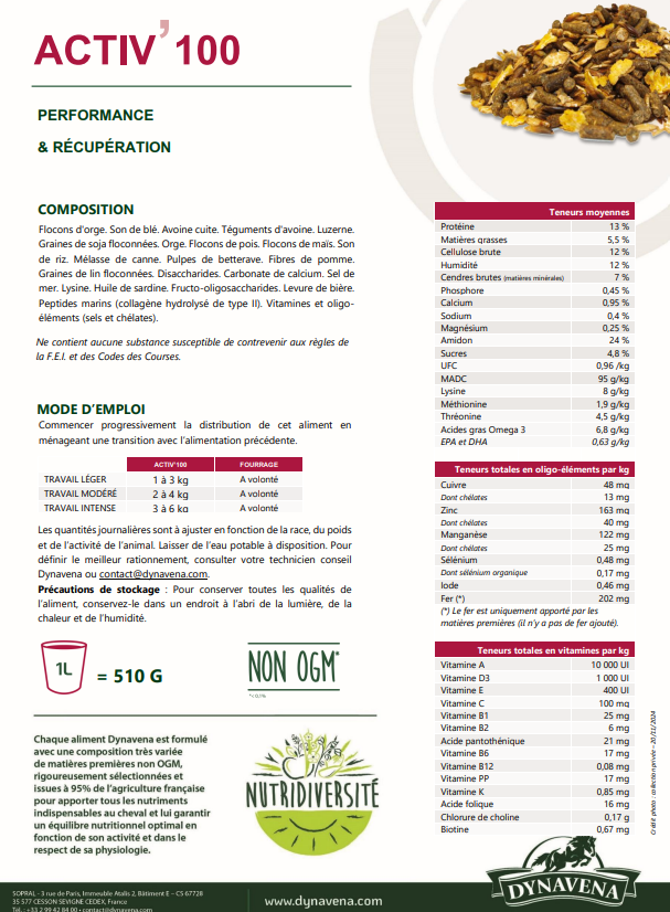 Apport de sources d’énergie diversifiées, sucres lents et rapides, oligo-éléments chélatés, antioxydants naturels (polyphénols), vitamines E et C, enrichi en EPA et DHA - Développement musculaire