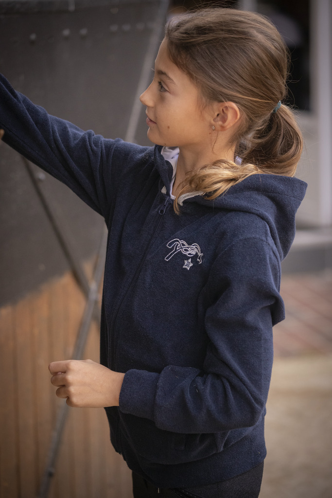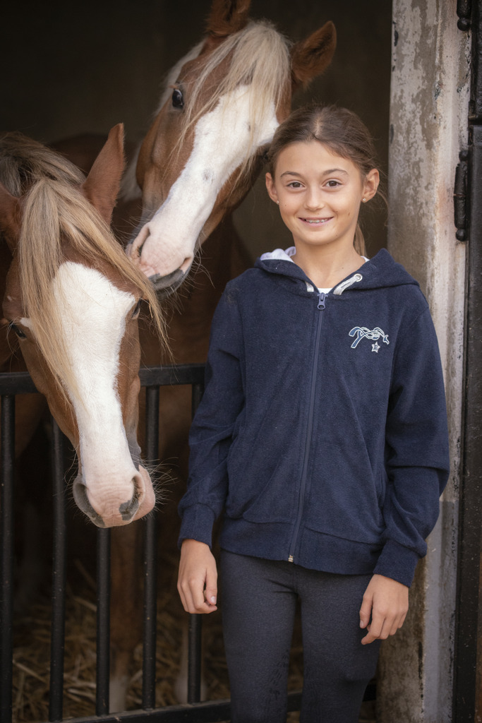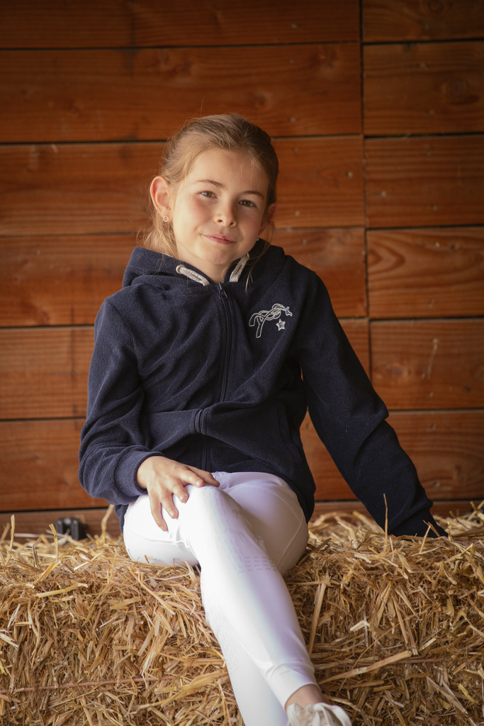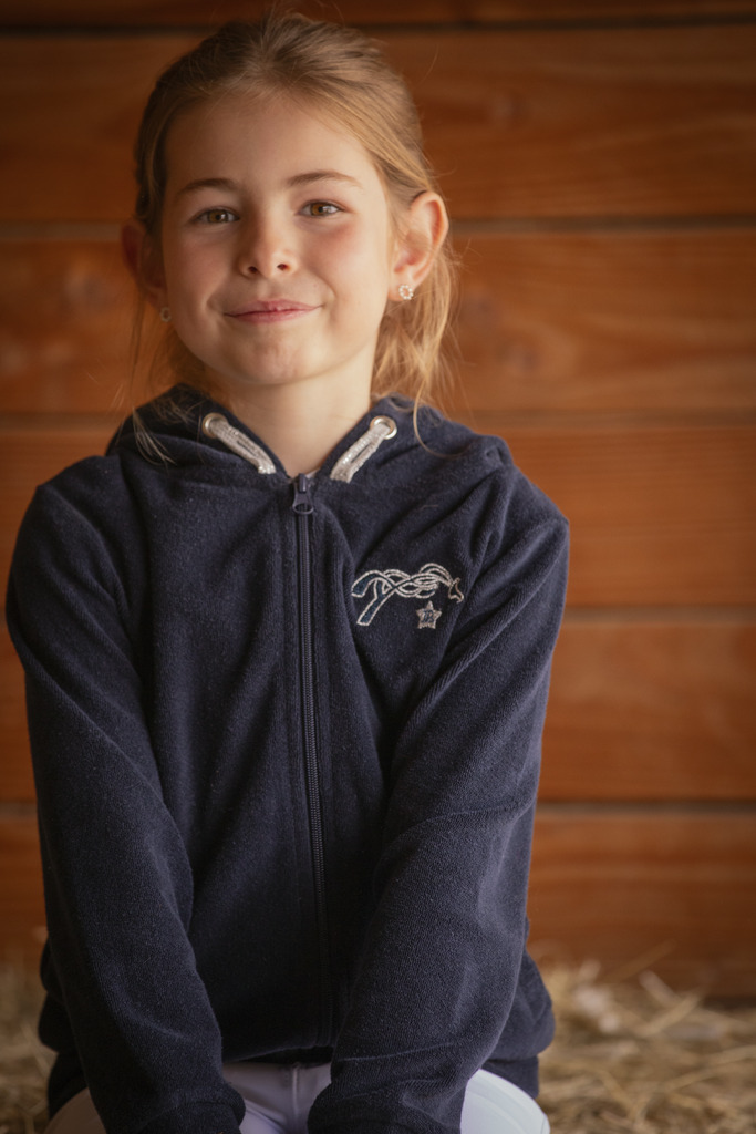 Adorable petit sweat-shirt à capuche « Capu Towel » de la collection Eden by Pénélope. Zipé sur le devant et confectionné dans un tissu éponge léger et confortable. La capuche est doublée d’un tissu clair et sur le coeur, on retrouve le logo Pénélope brodé en rose pâle et argent.