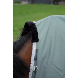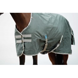 Couverture d’extérieur imperméable et respirante en polyester recyclé Ripstop 600 deniers avec coutures thermo-soudées, doublure nylon. Equipée d’un très grand rabat de queue imperméable, d’un pad de garrot en mouton synthétique, de sursangles croisées basses et d’une courroie arrière réglable.