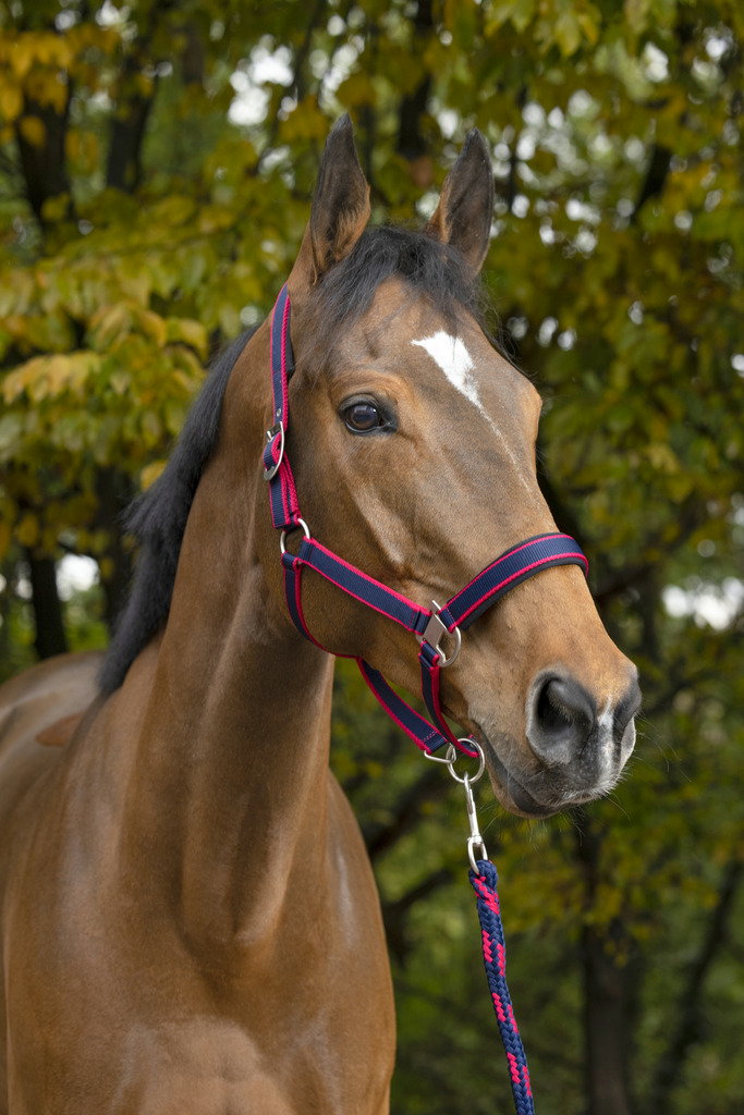 Set licol + longe. Licol en nylon double épaisseur avec muserolle et têtière réglables doublées néoprène. Ouverture rapide de la sous-gorge par mousqueton. Bouclerie en métal satiné. Assorti à sa longe d’attache de 2,30 m.