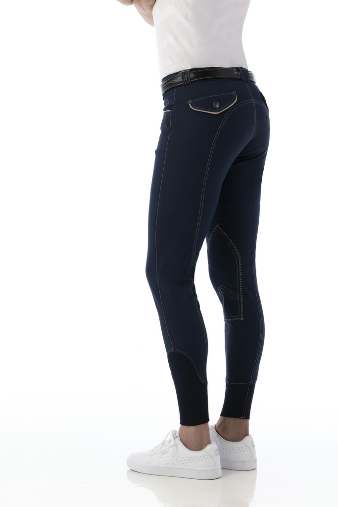 Equipée de poches cavalières à l’avant et de fausses poches pressionnées à l’arrière, toutes décorées de passepoils en coloris contrasté.