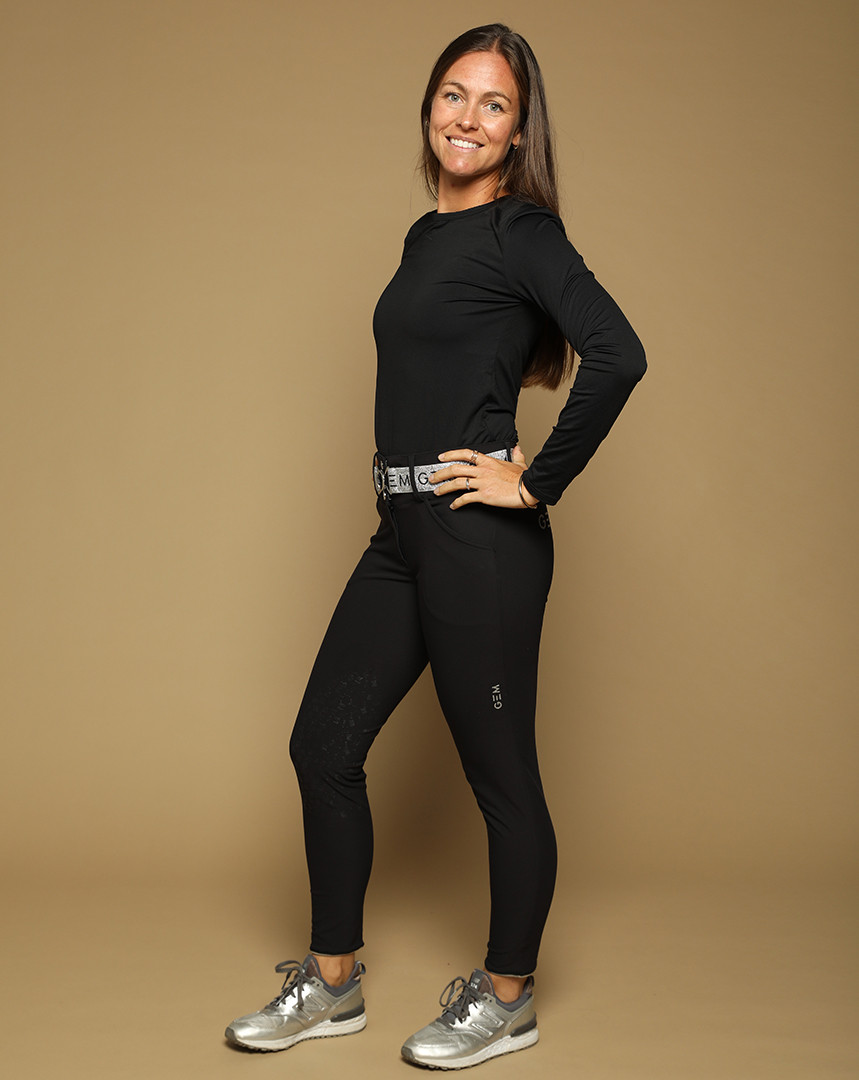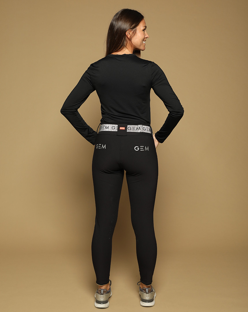On craque pour les logos GEM pailletés aux fesses. Ses grips aux genoux permettent une meilleure fixité à cheval.