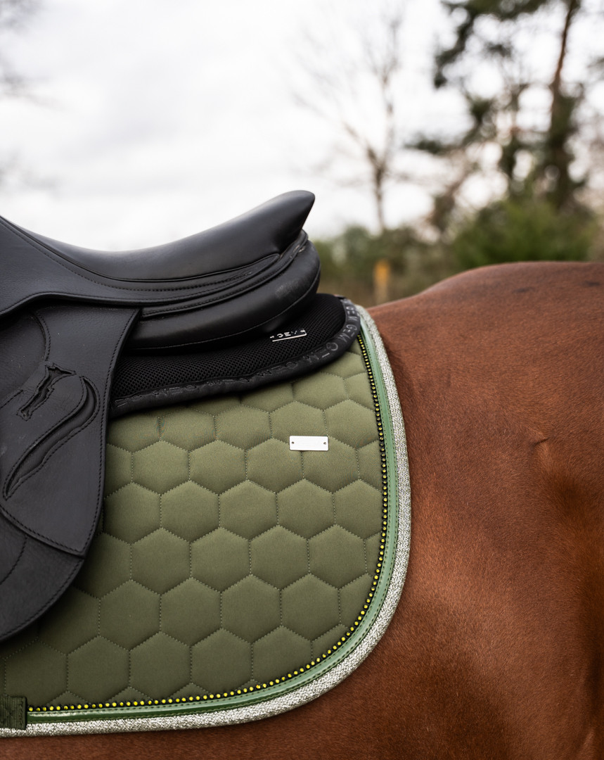 Enfin un modèle de tapis qui combine paillettes et strass, pour briller de mille feux sur les terrains de concours.