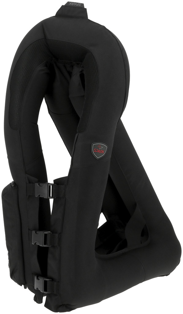 Le gilet airbag SPARK Hippodrome offre au cavalier une protection optimale en cas de chute. Le gilet est fixé à la selle à l’aide d’une lanière et se gonfle instantanément lorsque le cheval et le cavalier se désolidarisent. Il est équipé d’une cartouche de gaz remplaçable et protège l’ensemble du haut du corps, des vertèbres cervicales jusqu’au coccyx, grâce à l’air libéré dans la membrane intérieure lorsque la cartouche est déclenchée. Une fois gonflé, le gilet absorbe les chocs, le cavalier est amorti lorsqu’il heurte le sol et sa tête est maintenue en place. Léger et respirant, il peut être utilisé à une température comprise entre 0°C et 45°C par-dessus les autres vêtements pour une efficacité garantie. Côté confort, il est léger, parfaitement découpé au niveau des bras pour une totale liberté de mouvements, et doté de bandes en mesh pour une meilleure respirabilité. Passepoils réflectifs pour une meilleure visibilité en extérieur.
