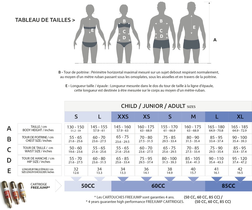 • Aucune limite de taille de cheval quelle que soit la taille de l’airbag. La nouvelle norme impose une taille minimum du cheval suivant la vitesse de déclenchement : un airbag qui déclenche lentement est utilisable sur un cheval de grande hauteur pour avoir le temps de gonfler avant de toucher le sol ! Les airbags à technologie FREEJUMP satisfont aux tests quelle que soit la hauteur du cheval… aucune restriction pour le consommateur.