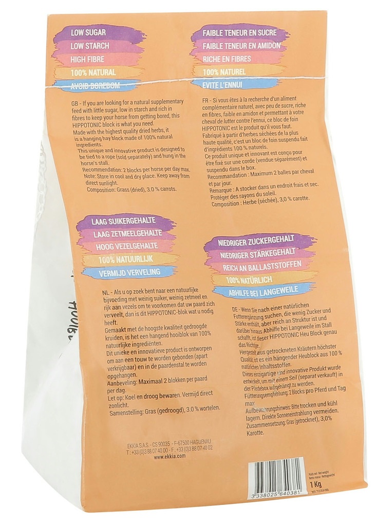 Si vous êtes à la recherche d’un aliment complémentaire naturel, avec peu de sucres, riche en fibres, faible en amidon et permettant à votre cheval de lutter contre l’ennui, ce bloc de foin HIPPOTONIC est le produit qu’il vous faut.