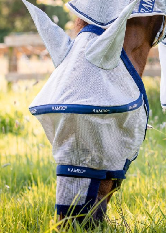 Le Masque Anti-mouches Rambo® Plus offre une double protection pendant la saison estivale, contre les mouches et contre les effets néfastes du soleil. Notre design unique offre une protection optimale des yeux contre les UV sans altérer la vision. Ce masque est à la fois résistant et flexible. Si votre cheval frotte sa tête contre un arbre, le masque anti-mouches se déformera puis reprendra sa forme initiale sans lui coller au visage. La protection de naseau détachable vous donne la possibilité de choisir ce qui convient le mieux à votre cheval et de protéger son museau sensible contre les rayons nocifs du soleil si nécessaire. Le bord en polaire douce assure un ajustement confortable tout au long de la journée.Masque anti-mouches idéal pendant la saison estivale