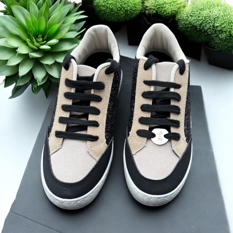- Détails en suédine beige et noire, à la fois doux et stylés