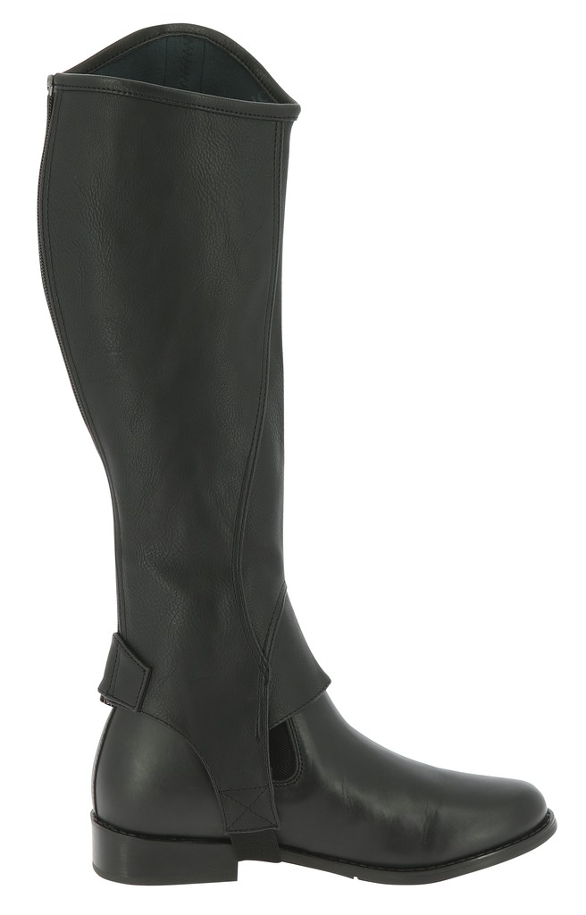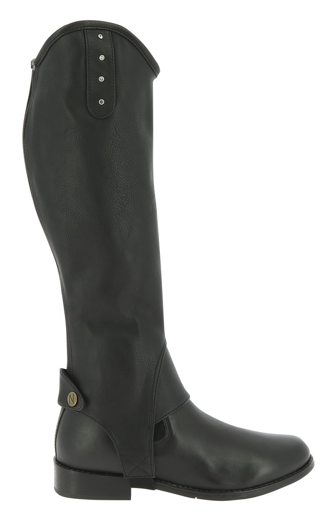 En polyuréthanne aspect cuir grainé. Effet galbant grâce à la doublure en tissu « stretch » Micro Touch élasthanne, décorée de 4 petits strass en partie haute. Passage de pied élastique et fermeture arrière à glissière YKK, sécurisée par un bouton pression sur rabat au bas.
