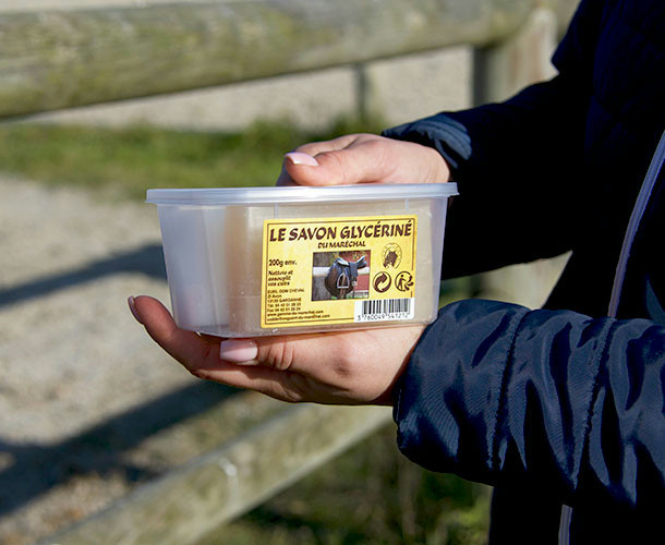 Le savon glycériné du Maréchal nettoie, fait briller et conserve au cuir (sellerie, maroquinerie, chaussures) toute sa souplesse. Présenté sous forme de pain de savon avec coffret protecteur, en spray ou en foamer (pompe qui diffuse une mousse onctueuse) pour satisfaire toutes les préférences d’utilisation. Facilité d’utilisation, odeur très agréable, ne se rince pas.