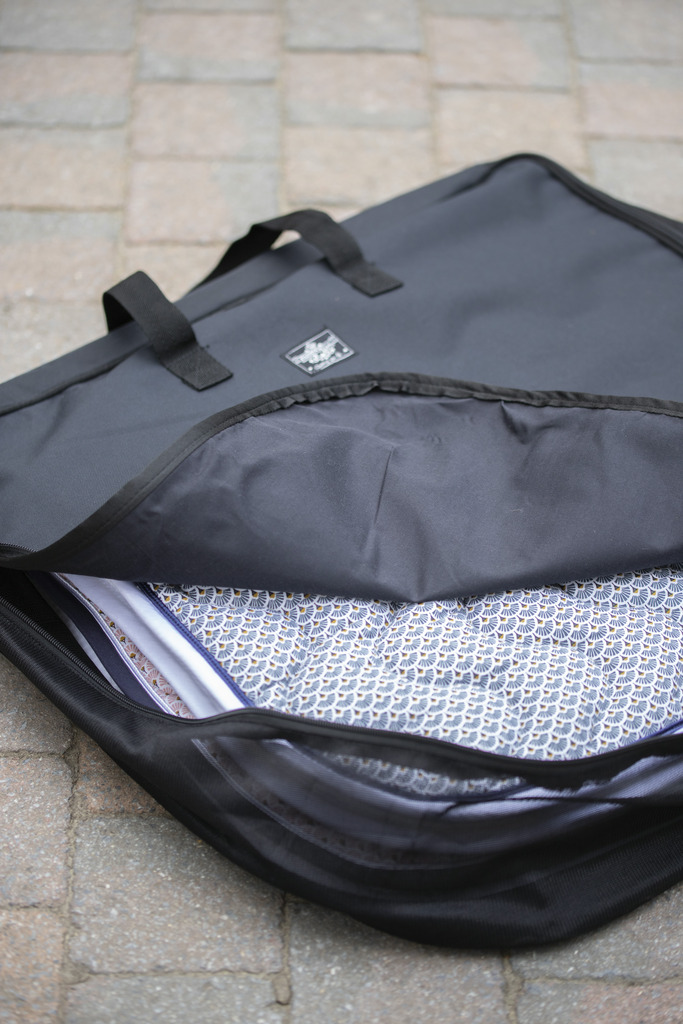 Très pratique, il est spécifiquement conçu pour stocker ou transporter vos tapis de selle. Il peut contenir jusqu’à 5 tapis mixtes ou de dressage. Il se ferme par zip sur 3 côtés pour faciliter le rangement. Sur les côtés, un tissu mesh permet une aération optimale des textiles. Il possède 2 grandes anses pour faciliter son transport ou l’accrocher facilement.