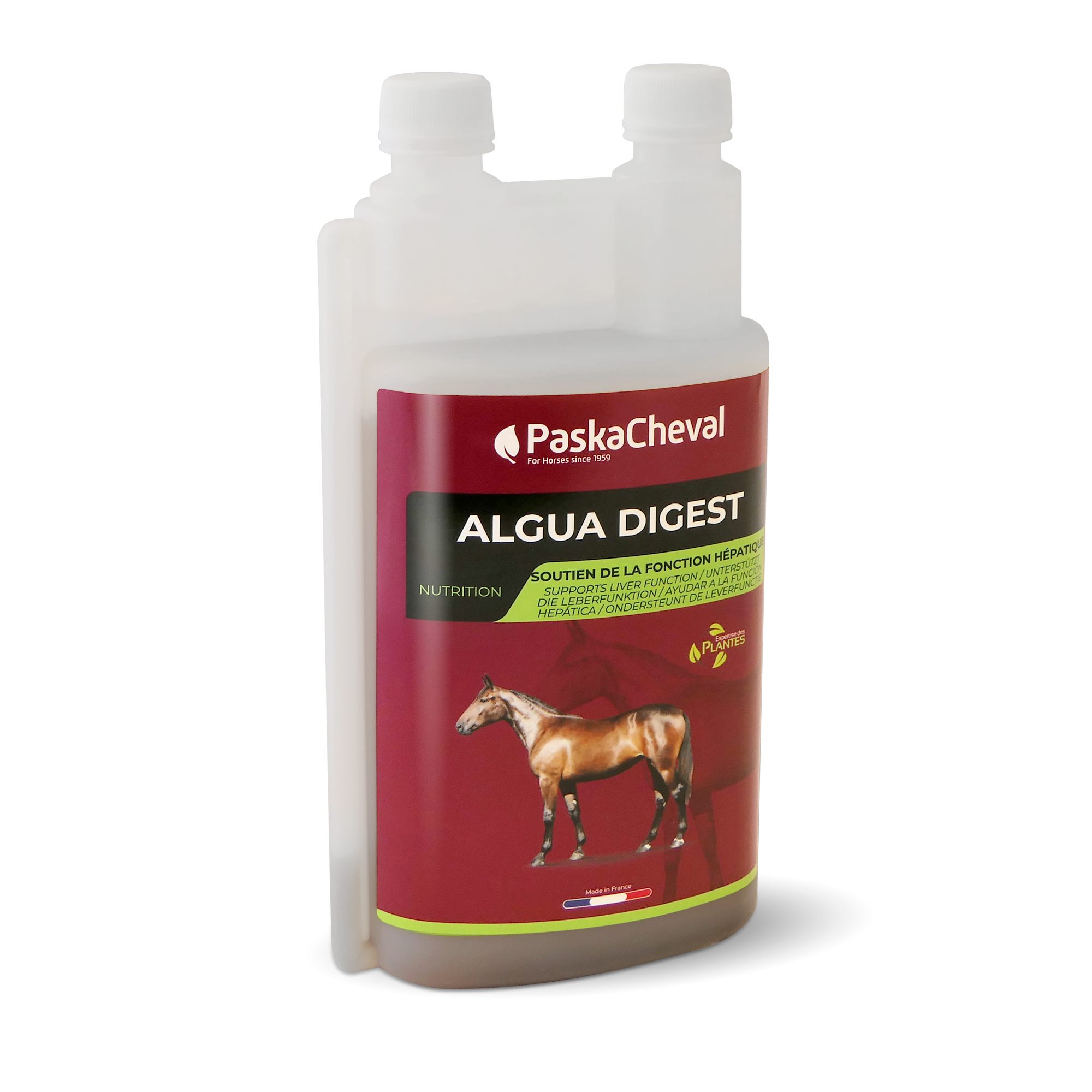 Algua Digest de Paskacheval, formulé à base de sorbitol, de farine d’algues marines et d’extrait de curcuma. Destiné à soutenir le foie du cheval et drainer l’organisme du cheval.