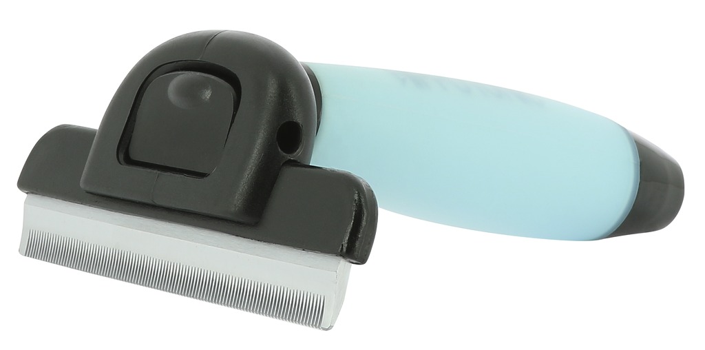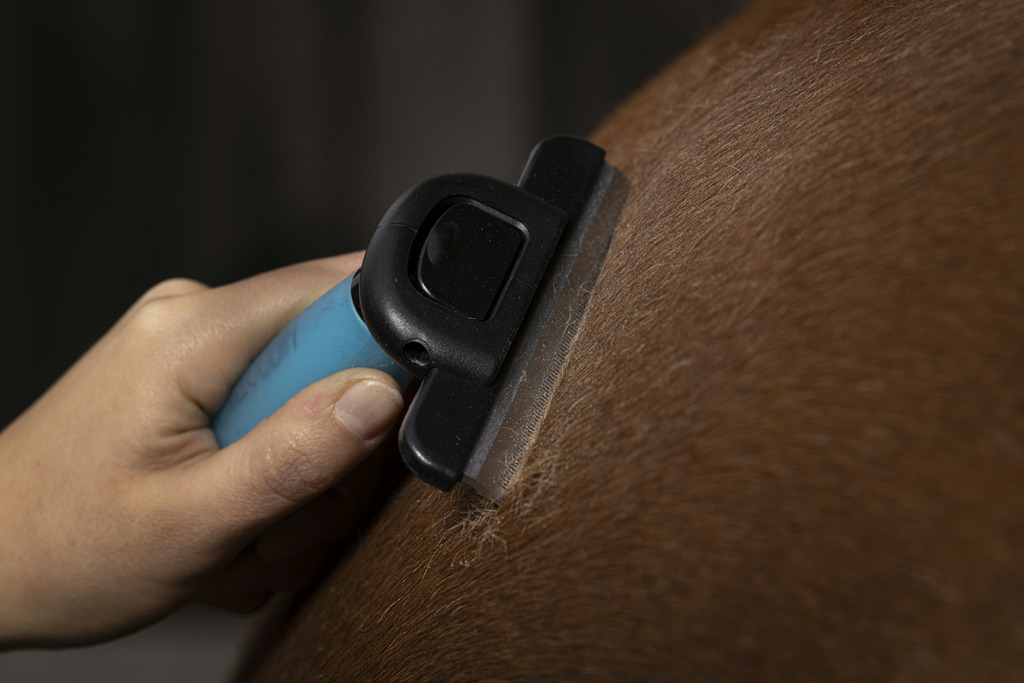 Pour enlever facilement les poils morts lors de la mue du cheval. En acier inoxydable. Poignée en ABS recouvert de gel à mémoire de forme. Culot perforé en ABS plaqué aluminium.