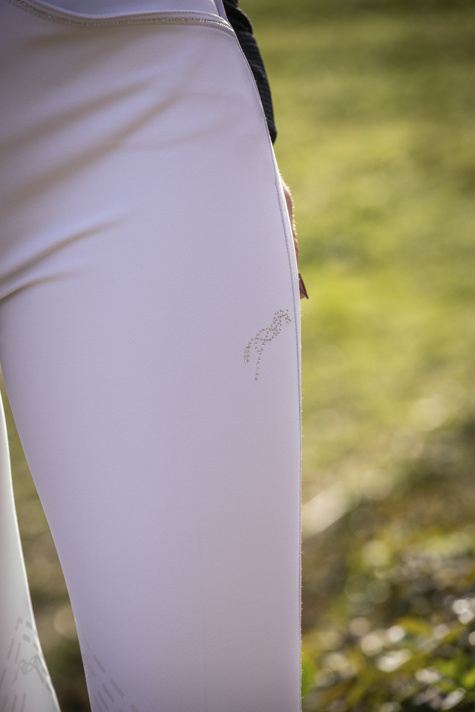 Pantalon d’équitation Élégance Pénélope doté d’un rang de strass sur la sur-ceinture mais également le long des deux poches avant et arrière. Un petit cheval Pénélope, également en strass, est posé au milieu de la jambe gauche. Ce pantalon d’un grand confort, grâce à son tissu stretch a des renforts anti-dérapants à l’intérieur des genoux et une taille légèrement haute, bien emboitante. Le bas de jambe est en lycra pour s’adapter à de nombreuses morphologies. C’est une très jolie pièce féminie et confortable à porter à l’entrainement, tous les jours, aux écuries.