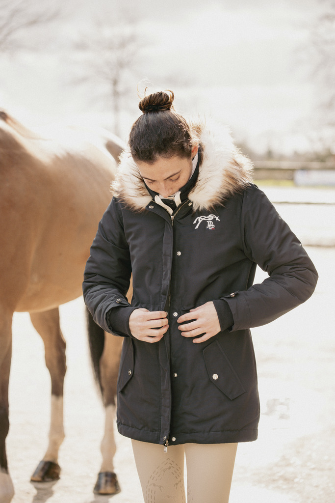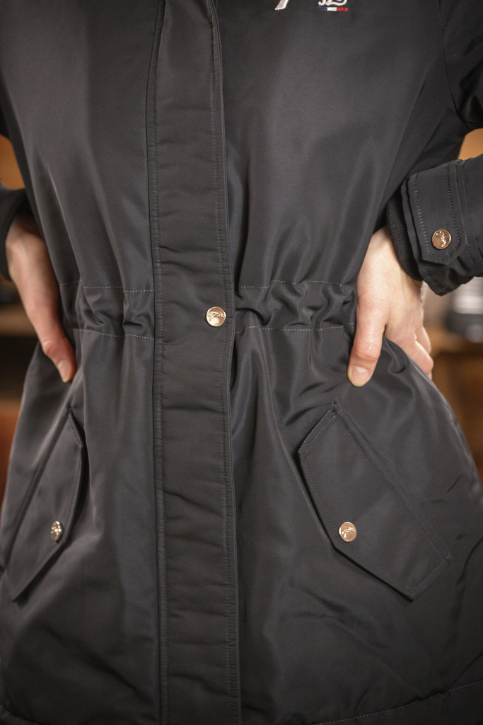 Dotée d’un grand zip sur le devant avec un rabat à pressions. Il est doublé d’une belle épaisseur de polaire ultra-douce tout comme sa capuche cerclée d’une très belle fausse fourrure. La parka Mega Lyon a un cordon de serrage à la taille et deux poches en biais fermée avec des pressions de chaque côté. Légèrement plus long, à l’arrière, il est doté d’une fente pour plus de confort. Il est idéal à porter aux écuries à pied, mais aussi en ville durant la saison froide.