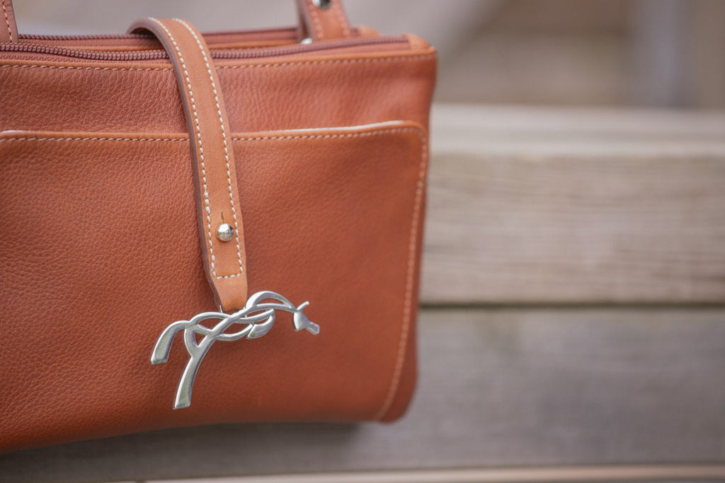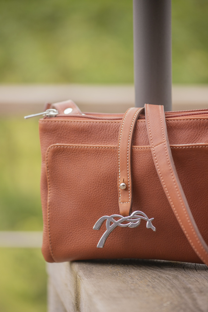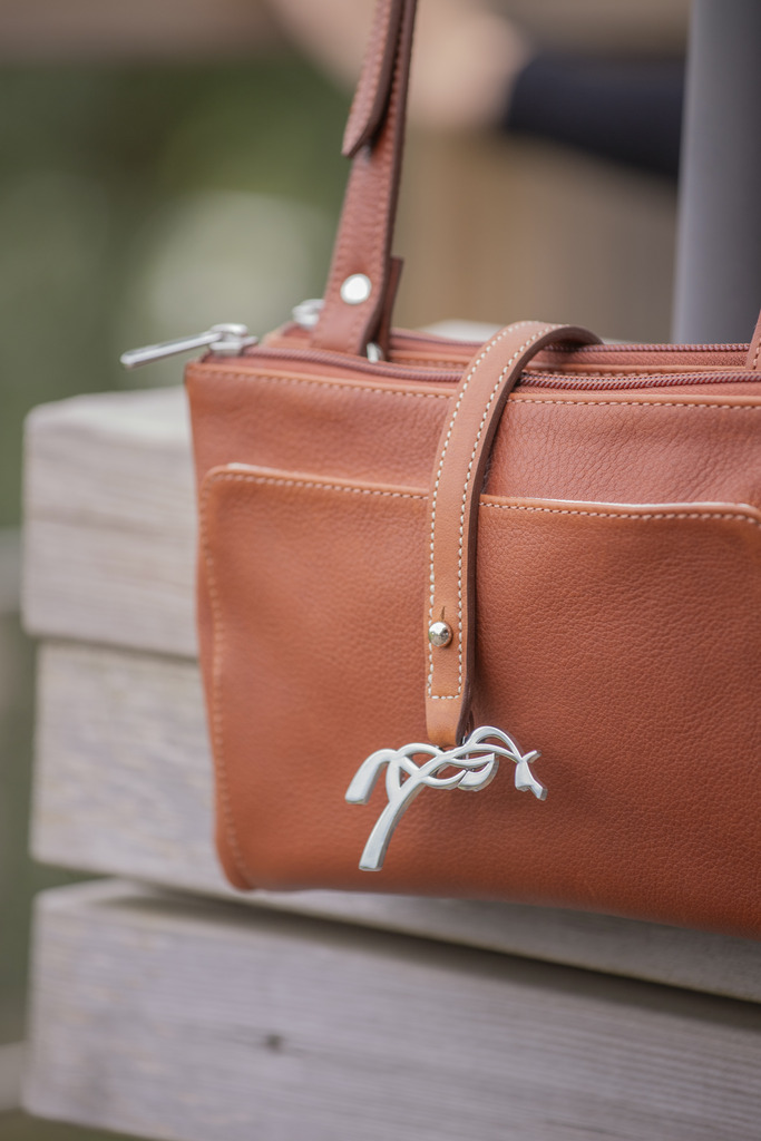 Une fine lanière en cuir rehaussé du logo Pénélope en argent maintient deux compartiments zippés. Le tout est confectionné dans un très joli cuir cognac. Il a également une pochette extérieure non fermée.
