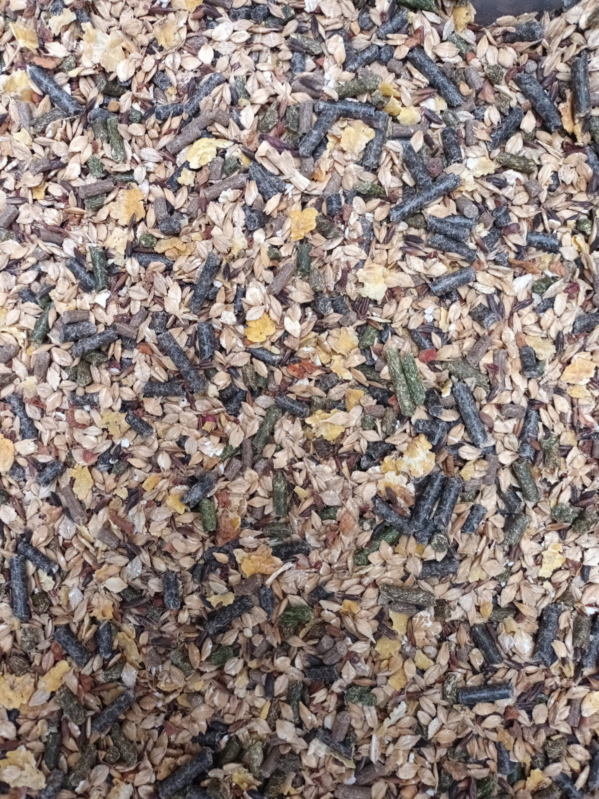 Composition : Flocons d’orge, Avoine cuite, Flocons de maïs, Graines de lin floconnées, Fibres de pommes, Carottes déshydratées, Extraits de plantes, Huile de colza, Algues, Orge aplatie, Pulpe de betterave, Son de blé, Luzerne et CMV