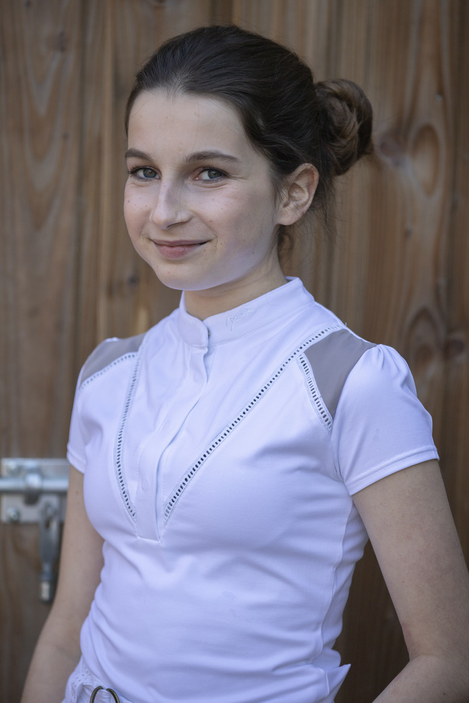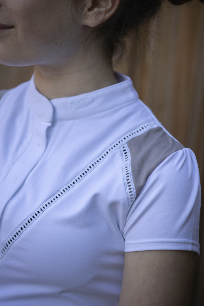 Polo de concours Pénélope manches courtes avec légers inserts de dentelle et épaules contrastées.