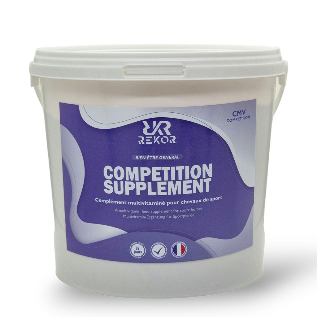 Spécialement formulé pour faire face à la demande accrue en vitamines, minéraux… lors de périodes de travail intense (entraînements, courses, compétitions). « »Competition Supplement » » apporte un concentré de vitamines notamment du groupe B, de minéraux et d’oligo-éléments nécessaires à l’équilibre du cheval de sport. L’apport en probiotiques + prébiotiques et MSM en fait un supplément de tout premier ordre.