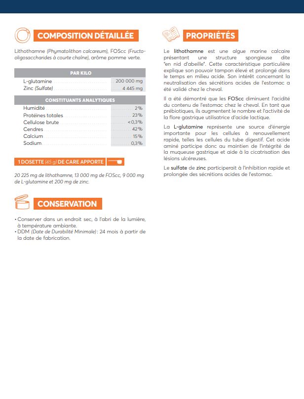 - Présence avérée d’ulcères gastriques chez le cheval, en complément d’une ration alimentaire adaptée.