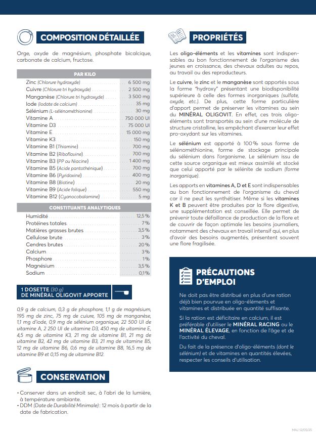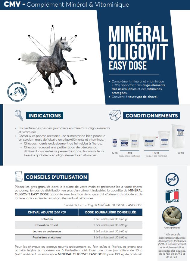 Reverdy Minéral Oligovit est un complément minéral et vitaminique (CMV) pour chevaux, poulains, poulinières et étalons apportant des oligo-éléments très assimilables et des vitamines protégées.
