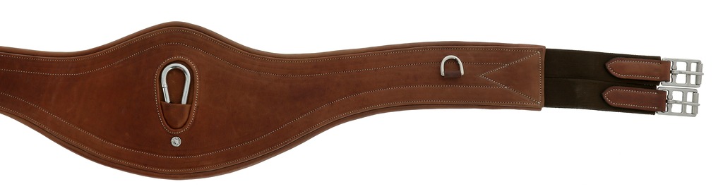 Sangle anatomique en cuir vachette matelassé mousse EVA de 4mm. Equipée d’un anneau central et d’anneaux latéraux pour la fixation des enrênements.