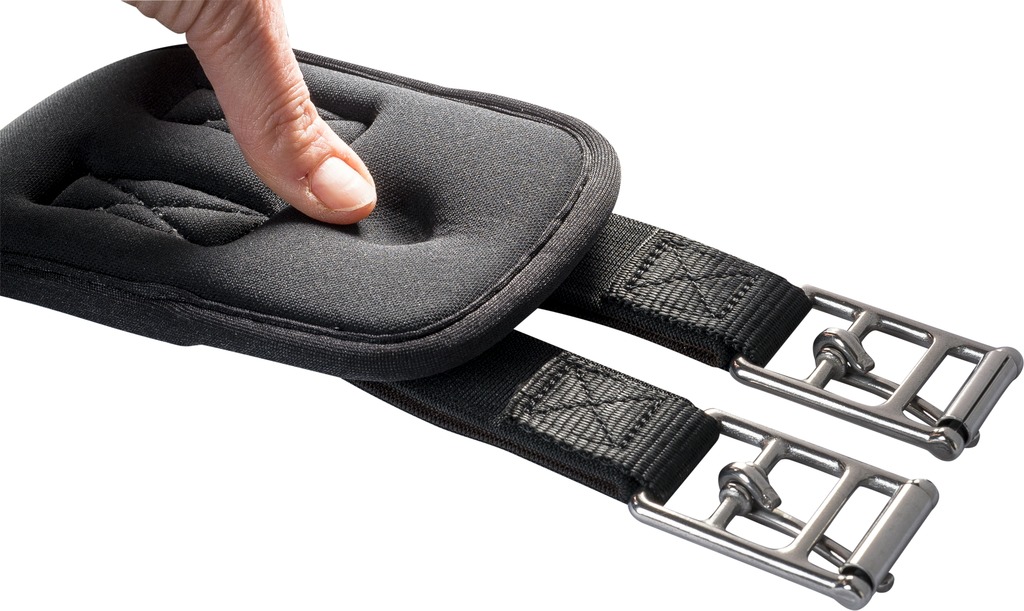 Intérieur en mousse à mémoire de forme, avec bandes de renforts en polypropylène cousues sur la housse en nylon en face externe et polyester mesh absorbant en face interne. Bordure anti-frottements. Anneau central pour enrênements. Boucles à rouleaux en inox, montées sur sanglons polypropylène et sanglons élastiques double épaisseur côté sanglage.