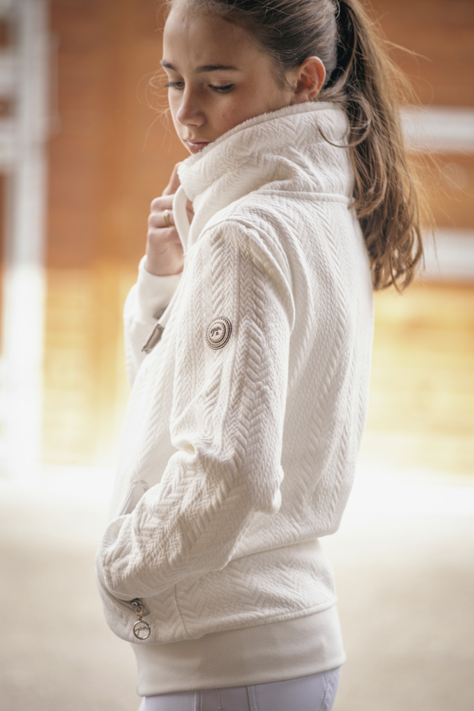 Sweat-shirt « Laponia » bien épais, zippé sur le devant, doté d’un grand col doublé de polaire et confectionné dans un tissu à chevrons en léger relief. Il a également deux poches zippées sur le devant. En haut de la manche gauche, une petite pastille de couleur cuivre avec le logo Pénélope réhausse cette pièce sportswear 100% dans l’esprit Pénélope. De couleur écru, il est idéal pour le porter en ville ou en mode cocooning, une fois rentrée des écuries.