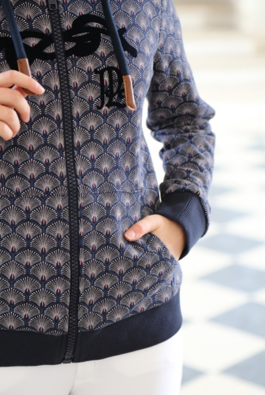 Le sweat imprimé avec de bonnes vibes ! Il se ferme et s’ouvre grâce à une grande fermeture zippée sur le devant. Le logo et les lettres PL sur la poitrine sont en aspect velours marine. Le motif s’inspire de l’ambiance art déco dans les tons marine et rose. L’intérieur est ultra doux et la capuche est doublée de polaire marine bien épaisse. Il a aussi deux poches ouvertes de chaque côté. À cheval comme en ville, le sweat Rosy sortira du lot … Chic !