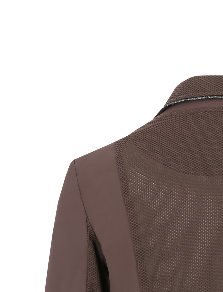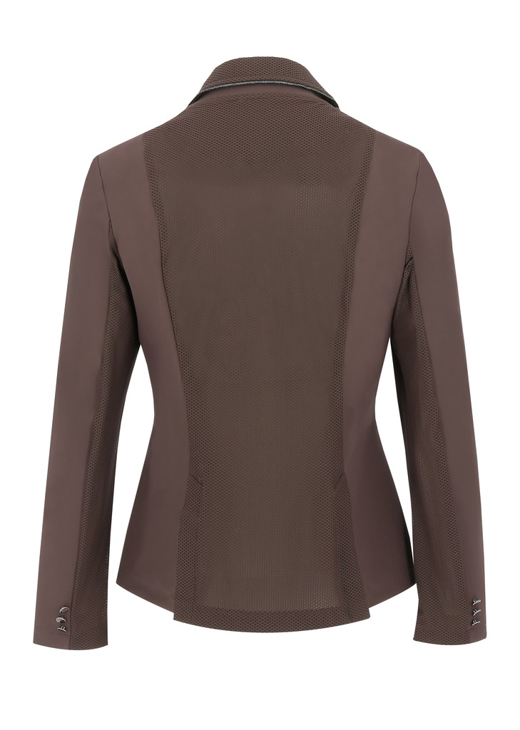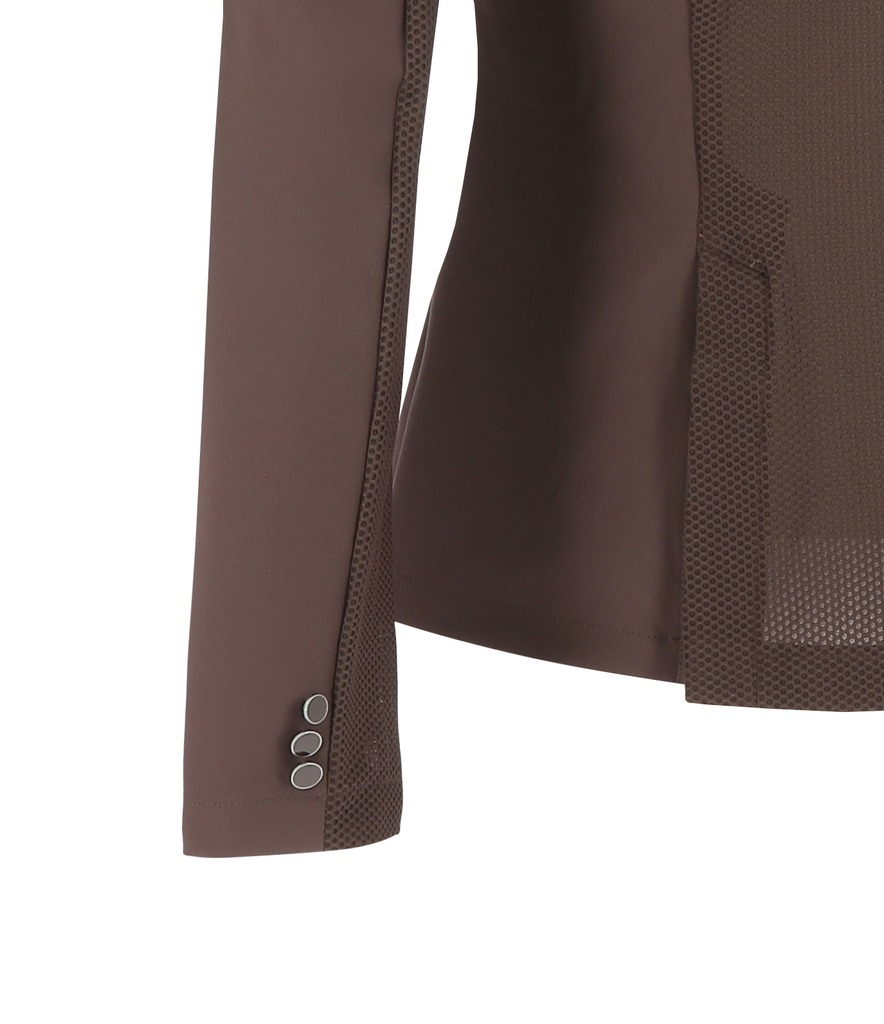 Veste de concours pour un confort maximum grâce à ses empiècements en mesh au dos et sous les bras. Textile déperlant, respirant, stretch et léger. Galon brillant en bordure de poches avant. Fermeture par 4 boutons.
